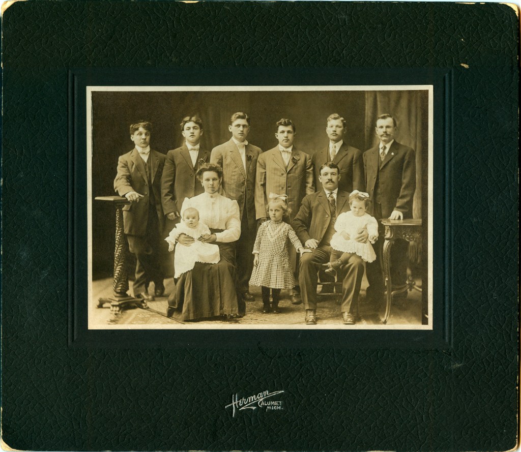 Pictured above (front row) are the Brayers (L-R my Aunt Rose, my grandmother Mary, my aunt Mary, my grandfather John Brayer, and my aunt Ann) circa 1913 whom were present at the incident of which Woody Guthrie wrote about in his song 1913 Massacre, occurring in the Coppermine town of Calumet Michigan. The gentlemen pictured behind them were the boarders of their rooming house. It was a common practice in those days to include inhabitants of your establishment in your family portraits. My grandfather saved his money from working in the copper mines and eventually bought a farm in Marshfield Wisconsin, on which my father was born in 1921.