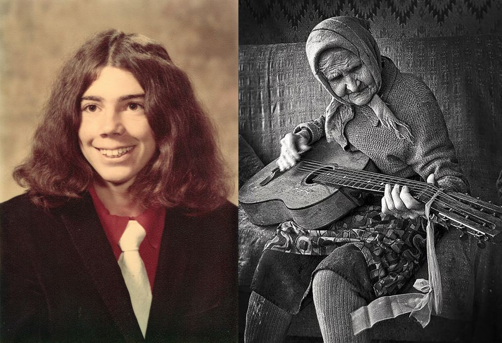 The author, pictured here in before and after style, him in 1972 with at least an ounce of hope in his eyes, graduating from Fontana High School with a single day of college in his future. The other image is how as he appears today, trying as he might to remember the lost chord.